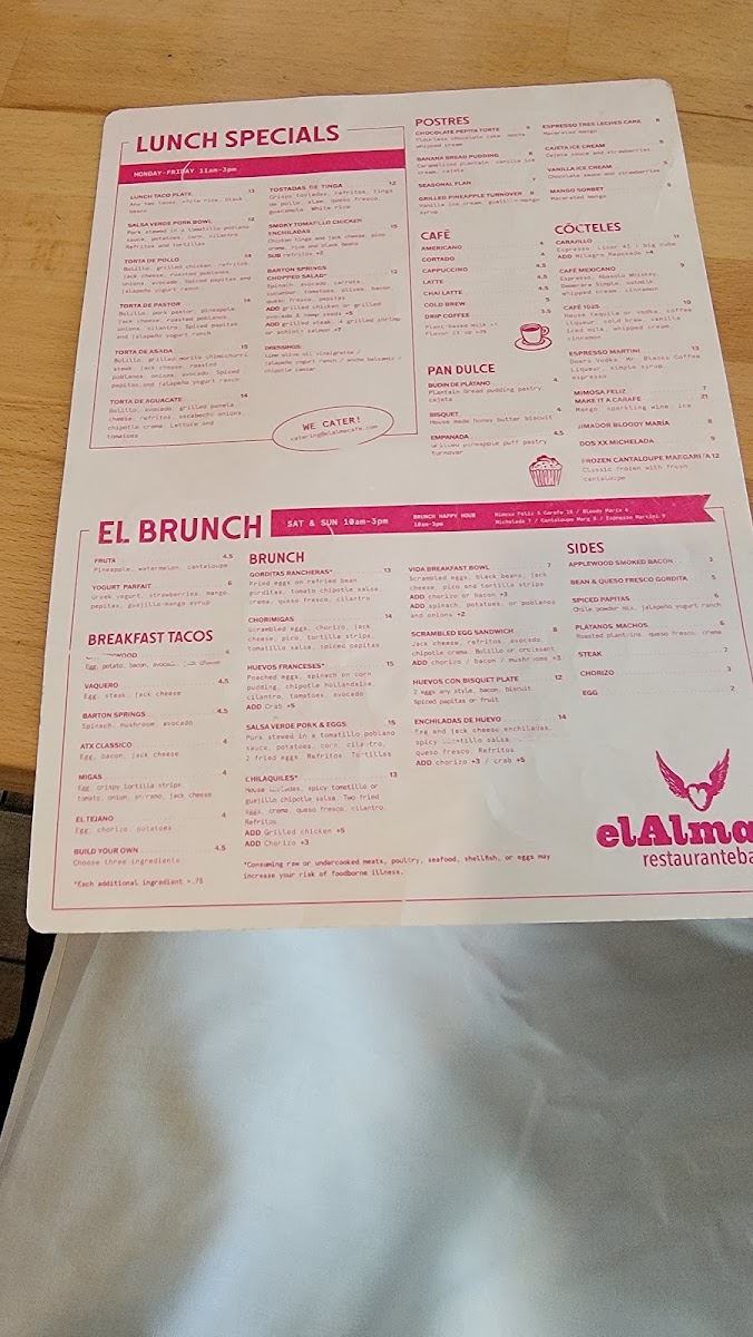 Welcome to El Alma South, nestled in the heart of Austin, Texas. This vibrant eatery serves an enticing array of authentic Mexican dishes and signature margaritas, perfect for both casual diners and adventurous palates. The menu showcases a delightful selection of frozen and rocks margaritas, such as the classic Frozen Mangorita and the inventive Cantaloupe Margarita, sure to tantalize your taste buds.
